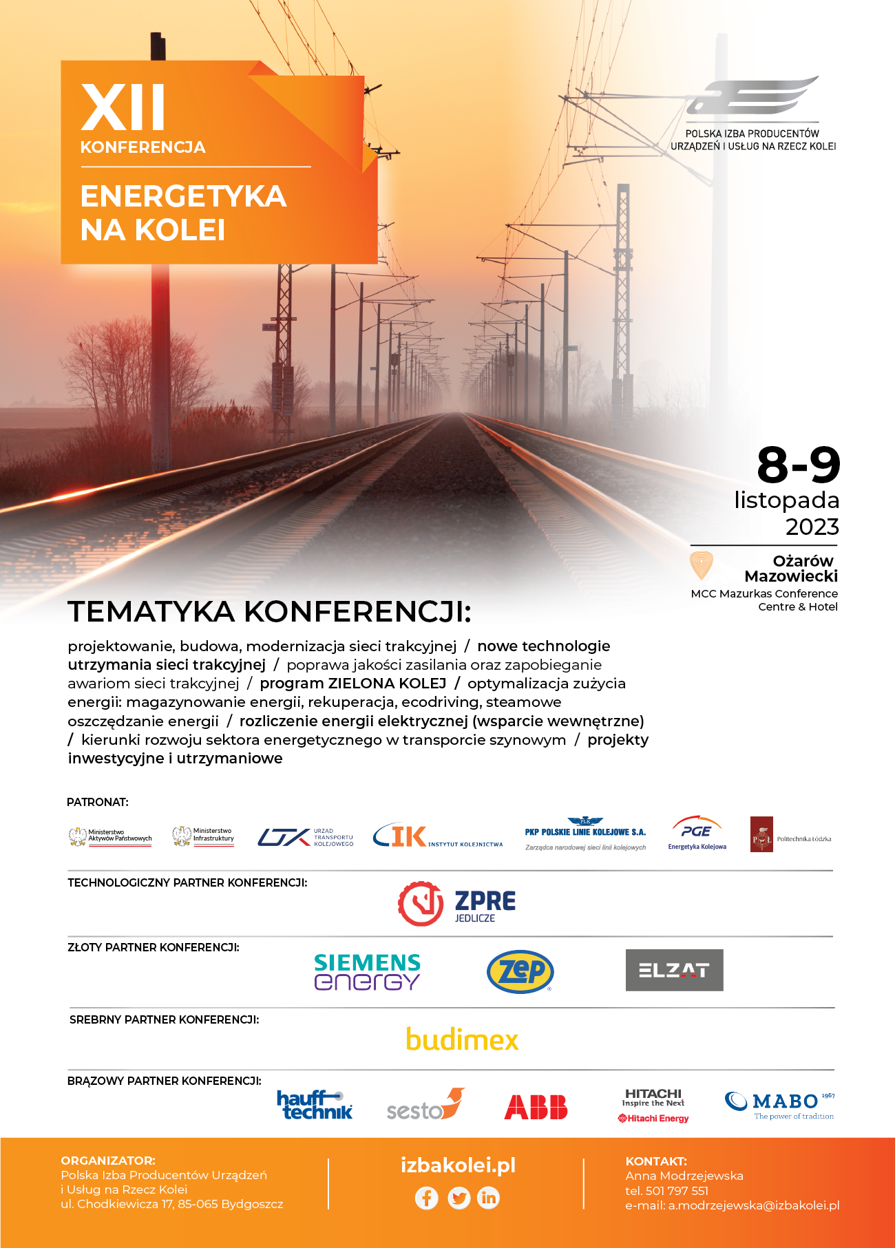 Zapraszamy do udziału w XII Konferencji „Energetyka na Kolei” która odbędzie się w dniach 8-9 listopada 2023 r. w MCC Mazurkas Conference Centre & Hotel Ożarów Mazowiecki.